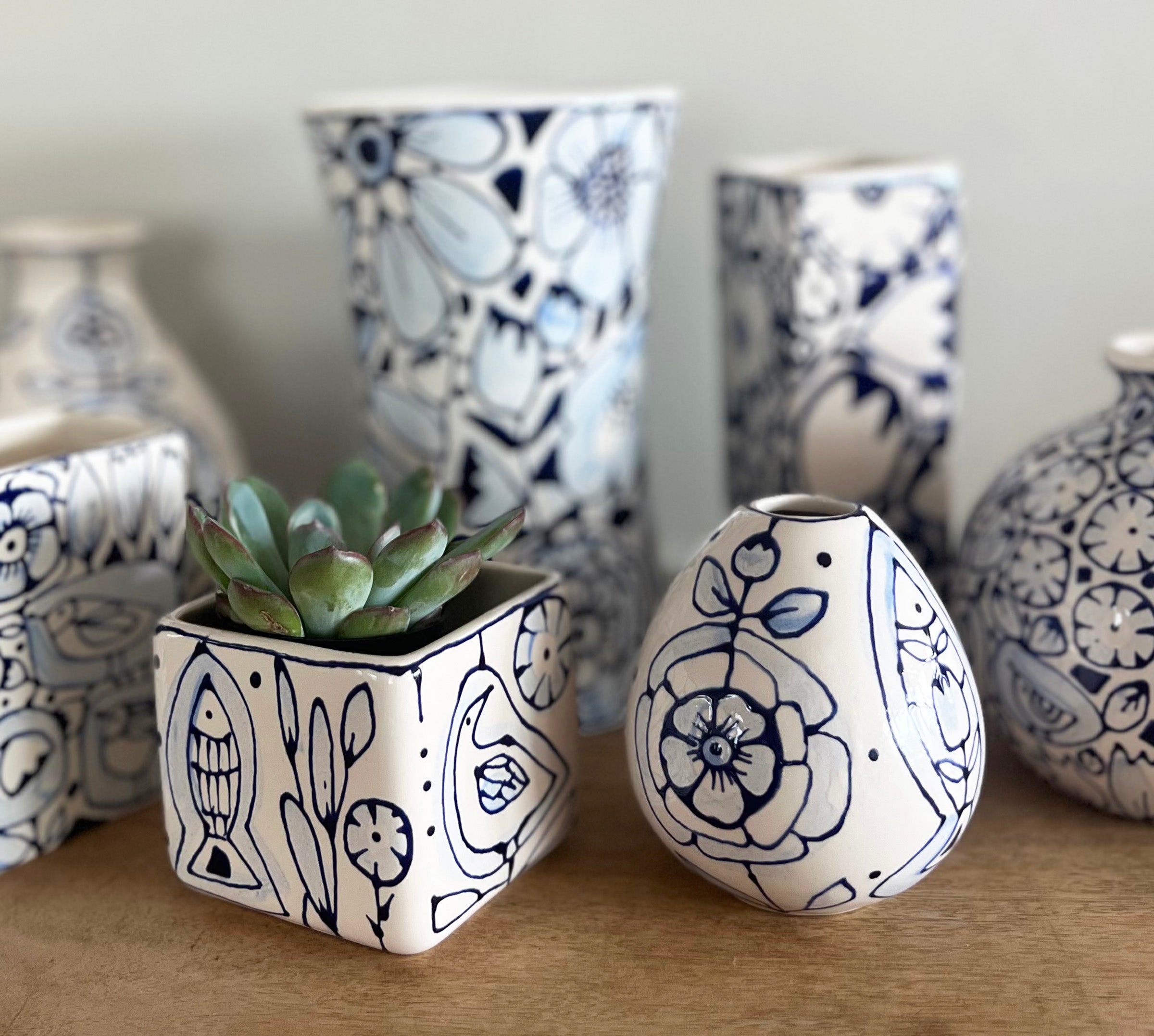 Inspired by nature, balancing graphic design and playful pattern, Stephanie creates timeless intuitive works of art that reflect nature in a variety of media. Her selection of hand painted ceramics combines simple coastal and floral motifs that bring a lighthearted touch to the home.