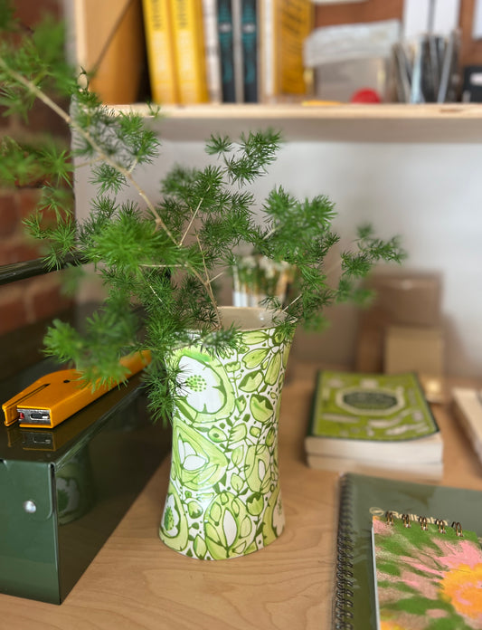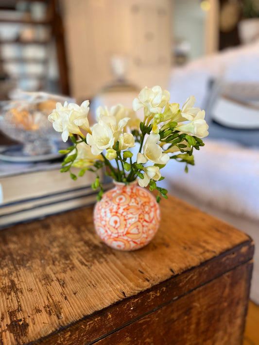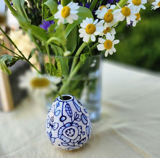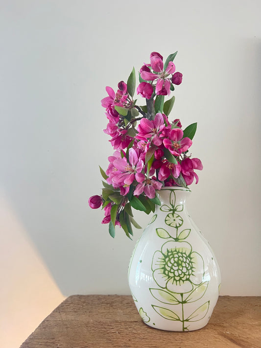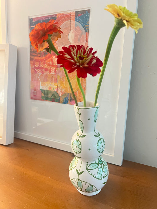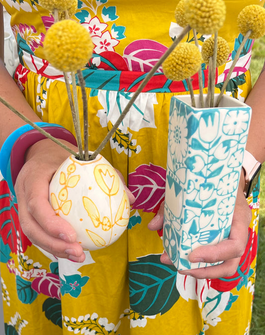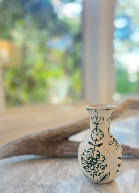 A hand-painted collection of vases thoughtfully designed to bring beauty and versatility to any space. Ranging in height from 3” to 10”, each vase features a distinct shape—some rounded and slender for single buds, others broader to cradle a small bouquet or a few artfully arranged stems.