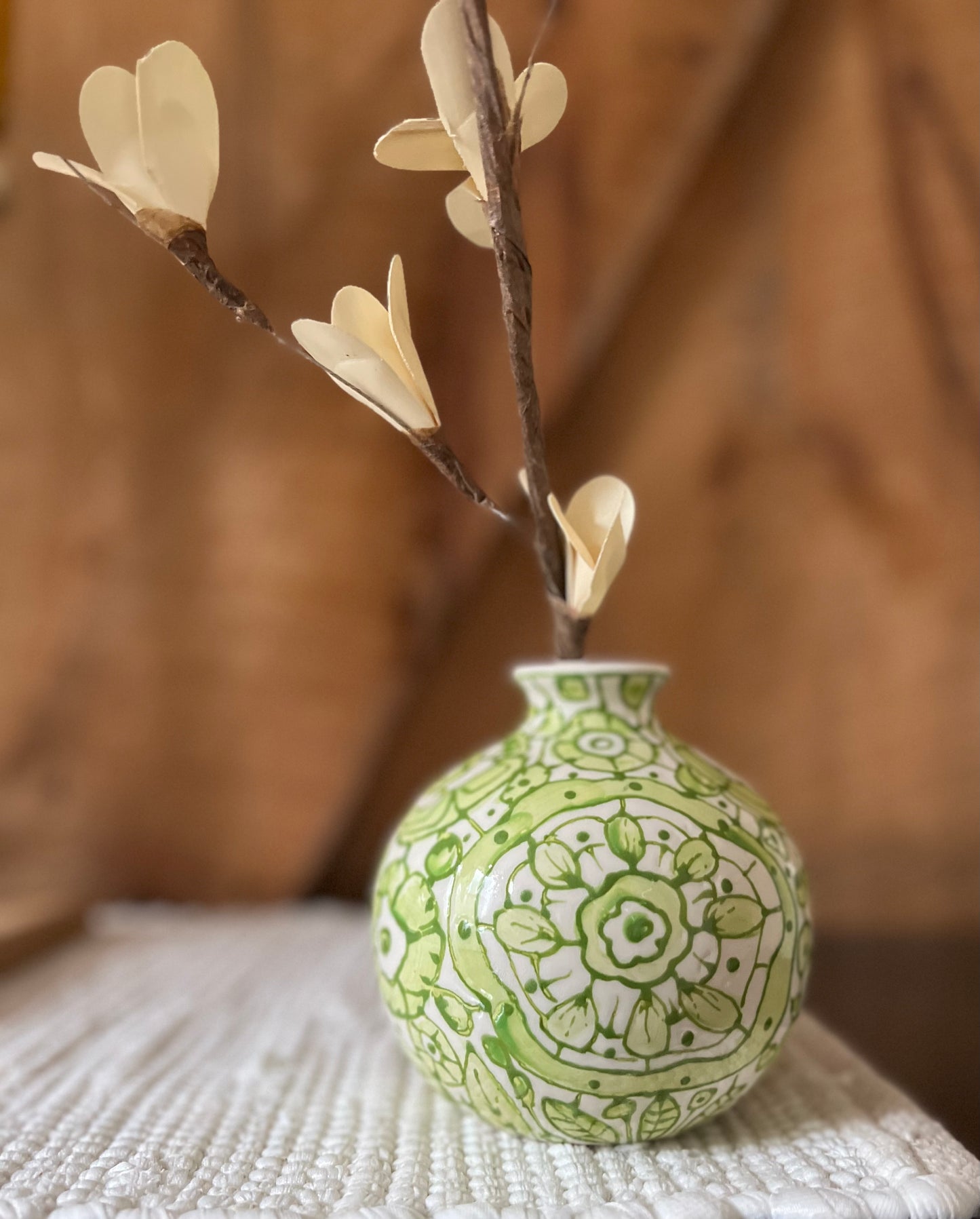 Beautiful 4.5” globe shaped vase offers a unique way to display fresh blooms from the garden, small arrangements or even for use with oil reed diffusers. Each piece is hand painted, one of a kind and made to order.